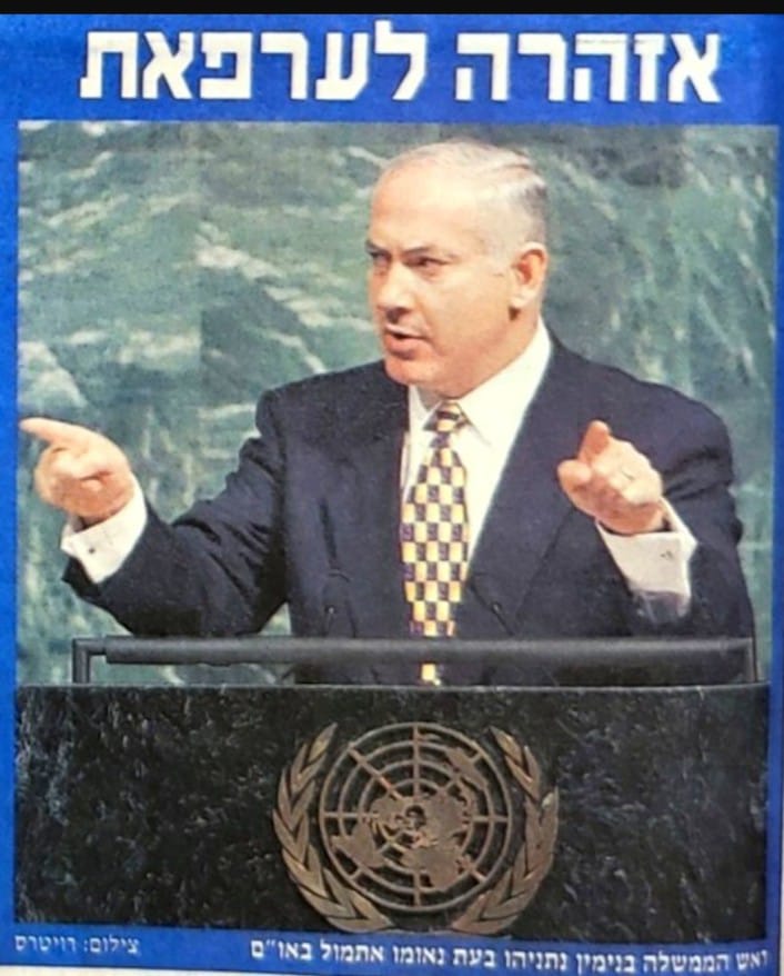 في عام 1998، اعتلى بنيامين نتنياهو منصة الجمعية العامة للأمم المتحدة لأول مرة بصفته رئيسًا لوزراء إسرائيل، بعد أن راكم خبرة سابقة كسفير لدى المنظمة الدولية. جاء ظهوره في لحظة سياسية دقيقة، حيث سعى إلى تعطيل توجه رئيس السلطة الفلسطينية ياسر عرفات لإعلان دولة فلسطينية من على منبر الأمم المتحدة.