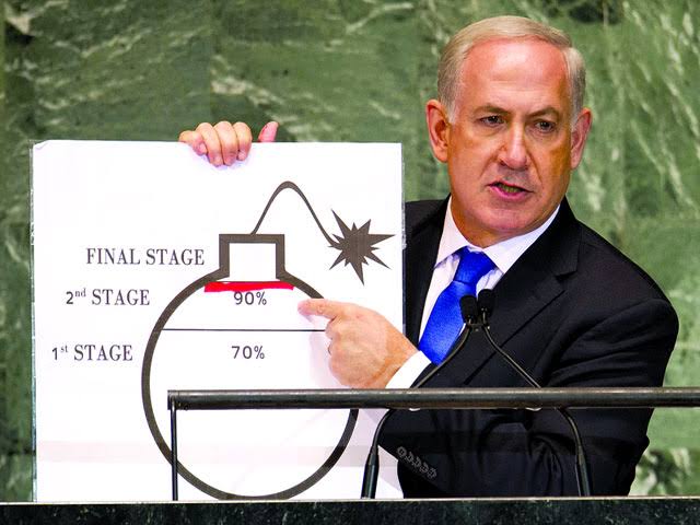في خطابه الرابع أمام الجمعية العامة للأمم المتحدة عام 2012، قدّم بنيامين نتنياهو أحد أكثر المشاهد إثارة للجدل في مسيرته الخطابية: عرض رسماً كاريكاتورياً لقنبلة شبيهة بما يظهر في أفلام الرسوم المتحركة، ملوّحًا به أمام الحضور ليحذر من أن إيران «ستصل إلى العتبة النووية بحلول الربيع المقبل أو الصيف على أبعد تقدير»، مشيراً إلى أنها ستكون على بُعد أسابيع أو أشهر قليلة من امتلاك سلاح نووي.